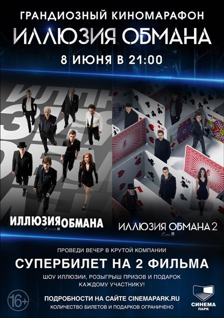В предстоящую среду в "Синема Парке" пройдет грандиозный киномарафон "Иллюзия обмана". Поклонники блокбастера увидят сразу два фильма, один из которых - премьера картины "Иллюзия обмана 2". Перед показом для гостей устроят шоу иллюзии и розыгрыш призов, каждый участник киномарафона получит памятный подарок.
